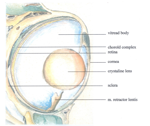 Cichlids have no fovea and there are no blood vessels inside the retina. Instead there is a rete choroideus of small vessels outside the retina and a few vessels embedded in the so-called falciform process entering the retina near the optic nerve and running towards the periphery where the m. retractor lentis is attached.