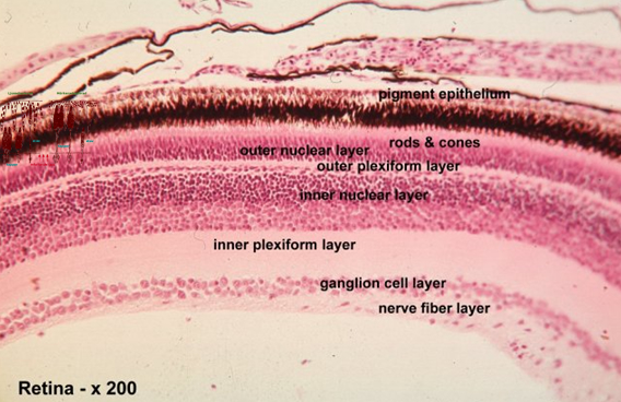 The cichlid retina shows the layered characteristics of the vertebrate retina with a pigment-epithelial cell-layer on the outside (sclerad) covering the photoreceptors (rods and cones). The photoreceptors are connected via various complex networks of intermediate neurons (horizontal-, bipolar- and amacrine cells) to the most vitread positioned ganglion cell layer. All separate ganglion cells axons are collected in the optic nerve. Generated by the environmental light conditions the rod- and cone photoreceptors can change position through migrating movements together with the melanin particles in the pigment-epithelial cells (retinomotor response; Ali, 1975).