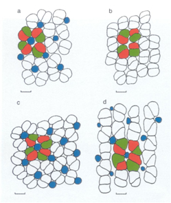 Rods and cones differ by their photopigment membranes. The photopigments in rods and cones are a mixture of rhodopsins and porphyropsins. The cichlid cones hold three different kind of porphyropsins which enables the fish to distinguish colours (Bowmaker, 1995). The cones are also arranged according to a regular mosaic of four double cones surrounding a central single cone. The two members of double cones hold alternate red- and green sensitive photopigments and the single cones hold a blue sensitive photopigment. Probably depending on the environmental light conditions, the single cones may be partly or entirely absent. In the latter case the double cones form a row pattern (Van der Meer et al., 1995). |