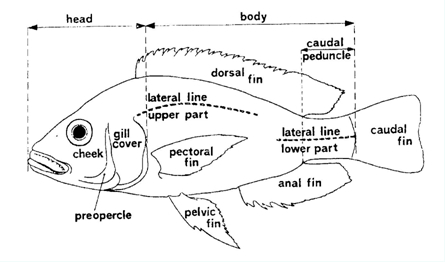 The body is normally perch-like, usually slightly compressed, occasionally very flattened as in the angelfishes. It and most of the head are covered with scales and the dorsal and anal fins have a series of spines in their front section continuous with the soft rays. The most obvious distinguishing feature amongst freshwater fishes is the single nostril on each side of the head. Apart from this and the long continuous dorsal fin all cichlid have pharyngeal (throat) teeth that assist in processing food and their lateral line is interrupted.