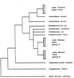 This flock of more than 500 endemic haplochromines was monophyletic and showed an extreme adaptive radiation. Virtually all habitats and food types were exploited by these cichlids. They comprised, for example, species feeding on phytoplankton, prawns, other fish, algae from substrates, snails and shells, insects, zooplankton and more peculiar resources such as cichlid eggs and larvae that are stolen from the mouth of brooding females. Though similar feeding habits and life styles occur in Lakes Malawi and Tanganyika, the morphological radiation in these lakes is more extreme, especially in Lake Tanganyika. In spite of the difference in the range of morphological radiation, species with similar feeding habits show similar adaptations in the three lakes. For instance, in each lake there are species picking insects from the substrate with forceps like teeth, species with lobed lips, etc. Many more of such examples can be given and could indicate polyphyletic species flock with each of several lineages having a geographic distribution that extends beyond the boundaries of a single lake (Greenwood, 1983). However, DNA sequencing revealed that the flocks of Lake Malawi and Victoria are monophyletic in origin (Meyer, 1993).