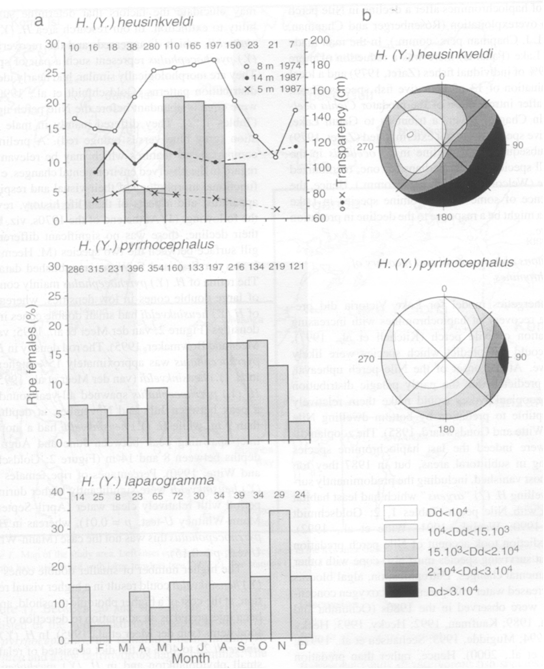 H. pyrrhocepalus and H. heusinkveldi occupied virtually the same habitat. Nevertheless, they were segregated by different reproductive strategies, food preference and visual capacity. With a higher retinal resolution H. heusinkveldi could detect smaller food items and included phytoplankton in its diet which has never been found in the stomachs of H. pyrrhocephalus.