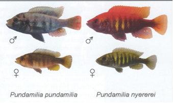 It is remarkable that the extreme radiation in Lake Victoria was achieved in the geologically short time span of less than a million years and possibly even less than 15.000 years. This can only be partly explained by allopatric speciation: during the process of drying and refilling, populations may have become isolated and genetic drift and adaptations to local conditions may have resulted in speciation. A famous example is provided by the 4000 years old, satellite-lake Nabugabo in which 5 species evolved, that mainly differ in male colouration from their sister species in Lake Victoria.