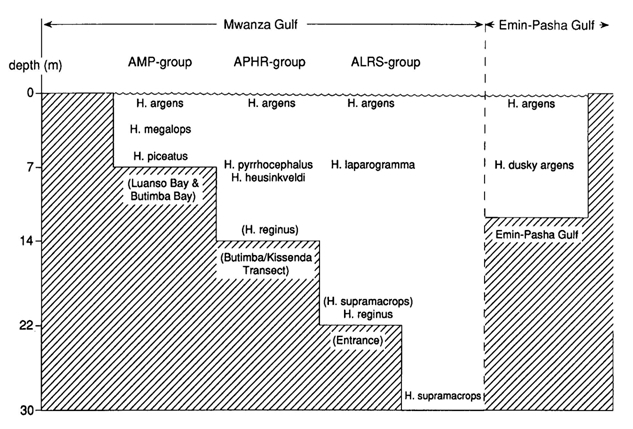 At least ten zooplanktivorous species were present in a rather small part of the Mwanza Gulf. In general these species were segregated by bottom-type, distance from the shore and level in the water column. H. argens had a broad horizontal distribution in both the Mwanza Gulf and Emin Pasha Gulf, where it was mainly restricted to the top layer of the water column (0-2 m). H. megalops and H. piceatus occurred in the shallower regions (2-7 m) of the Mwanza Gulf. Trawl catches suggested that the latter species dwelled closer to the bottom, while H. megalops had its main distribution slightly below H. argens. H. pyrrhocephalus and H. heusinkveldi had their main distribution in slightly deeper water (8-14 m) in the centre of the Mwanza Gulf. Vertically they took an intermediate position between H. argens and H. reginus during the day, while they migrated towards the surface at night. H. reginus remained closer to the bottom and also occurred outside the Gulf near the Entrance. The deepest regions of the Mwanza Gulf are near the Entrance (15-22 m). This was the principle area where H. laparogramma occurred at intermediate depths between H. argens and H. reginus. Another species from the Entrance of the Gulf, H. supramacrops, was probably a bottom dwelling species. About 150 km westward, H. dusky argens occurred below H. argens in the Emin Pasha Gulf, a habitat comparable to the shallow one in the Mwanza Gulf. Some species showed considerably overlapping distributions. Diurnal vertical migrations were common while the location of spawning sites suggested occasional horizontal migrations.