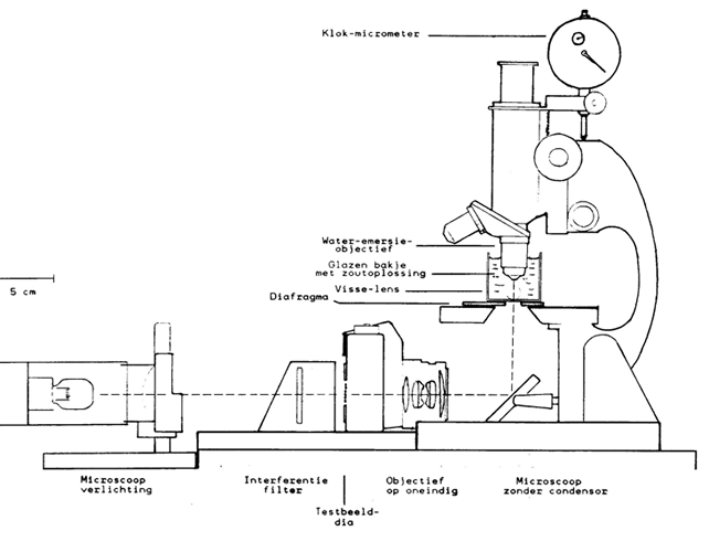 Focal lengths were measured using a slide with testing image mounted in the focal plane of a camera objective (set at infinite) and a water immersion objective (100 x) mounted on a modified microscope. The distance between the lens surface and the projected image of the slide in the focal plane of the eye-lens could be measured with the aid of a circular micrometer mounted on the microscope.