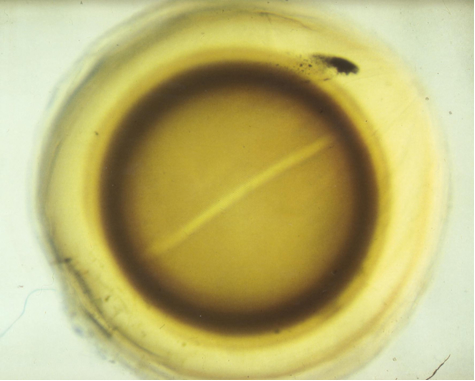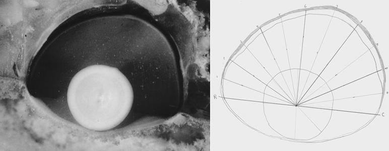 All fishes were anaesthetized with an overdose of MS222 (1g/l) before they were measured (SL) and both their eyes were isolated. Lenses were separated from the left eyes (which were used for further retinal investigations) and of the right eyes the sclerae were carefully removed. All measurements were carried out in a solution of 0.75% NaCl.  A thick PVC sheet with circular wholes (3-6 mm) was placed at the bottom of the glass container holding the solution in order to fix the lens or the entire eye. The bottom of the glass container was very thin (microscope covering glass) to reduce optical influence to a minimum. Lens diameters were measured in four directions using a Nikon projection microscope (20 x). Halving the mean value provided the lens radius (r).