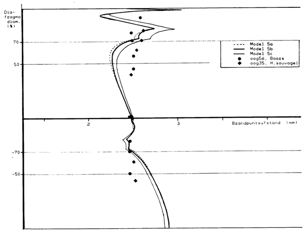 Halfway the axial sections through the eyes, pictures were taken of transverse sections of the head or of a separate eye with the aid of a macro objective mounted on a Nikon 35 mm camera. Enlarged drawings were made of the projected pictures which determined the original position of the lens and retina, the shape of the lens and of the eyecup. The image distance was measured from the centre of the lens to the receptive layer of the retina in 11 directions in each section from 15 degrees to 175 degrees in relation to the sagittal axis of the eye lens. The focal length f as a function of the lens radius was superimposed in the drawings together with the image distances matching nearby objects (in) and distant objects (ib) to present the depth of field from nearby to infinity (see below).