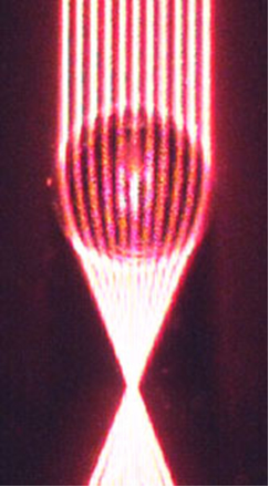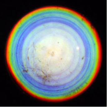 The centre and surround focal lengths were measured at red light (650 hm; no chromatic aberration) by means of a Schlieren test using an object glass with so-called ring-apertures (black paint; 0,6-3,0 mm) or a non-transparent plastic sheet with reducing-apertures (openings; 1-2 mm) underneath the glass container holding the lens. Ring- and reducing-apertures deviated less than 1% from true circles. Various ring-apertures were used to cover increasing areas up to 50%  of the central part of the lens (r varying from 10% to 65% of the lens radius). Various reducing-apertures covered increasing areas up to 50% of the peripheral part of the lens (r varying from 66% – 100% of the lens radius). The mean value between the centre and surround focal lengths was taken as the average focal length (in red light). The relative spherical aberration for centre and surround light-beams was given as a percentage of this average focal length (the absolute spherical aberration is known as the difference in focal length between the centre and surround incoming light-beams).