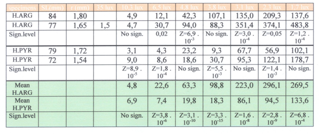 Adult specimens of H. argens and H. pyrrhocephalus were collected from the livestock in our department and compared with respect of their feeding behaviour under various light levels (1,7 lx – 35 lx). Measured were the reaction distance (RD) and the search time (ST). The relation between the mean RD and the various light levels was checked using one-way analysis of variance (Anovar in Statgraphics). Mean RD’s were compared between individuals and groups, using two-sample analysis results (Twosam in Statgraphics). Mean ST’s were compared between individuals and groups, using double-sided Mann-Whitney-test.