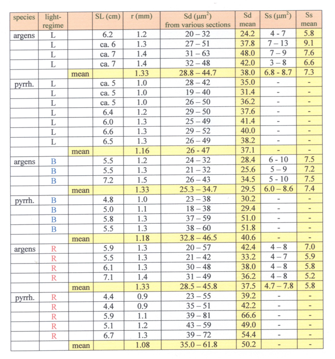 This result does not confirm the hypothesis that H. argens was more and more worsted by competition and predation and finally disappeared completely. Normally raised specimens of H. pyrrhocephalus clearly have lower photopic thresholds than similar specimens of H. argens (Smit & Anker, 1997; this study), among specimens raised in red light the expected significant difference in photopic threshold was not established. This may be due to the used method where discrete intervals (grey filters) were used instead of a continuous decrease of the light level. A more convincing explanation concerns the difference in eye size of the compared specimens of the two species. On all occasions the lens radius (r) of H. pyrrhocephalus was about 25% smaller than that of H. argens. As described above this has severe influence on the cone size and thus on the photopic threshold. Measurements on the ontogenetic development of cone size and photopic threshold in H. sauvagei (Van der Meer, 1994) revealed that such a decrease in cone size could easily coincide with an upraise of the photopic threshold with 0.3 log units of the illuminance threshold. If this would not only be the case in H. sauvagei but in H. argens and H. pyrrhocephalus as well, than a more significant difference between the photopic thresholds of specimens with equal eye size could be expected.