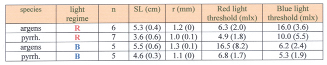 In all comparative experiments the eyes of H. pyrrhocephalus were smaller than the eyes of H. argens. In the B-specimens no significant difference was found between the two species for the blue light thresholds. The red light thresholds were significantly lower in the B-specimens of H. pyrrhocephalus. In the R-specimens no significant difference was found between the two species for the red light thresholds, whereas the blue light thresholds were lower (but not significantly) in H. pyrrhocephalus.