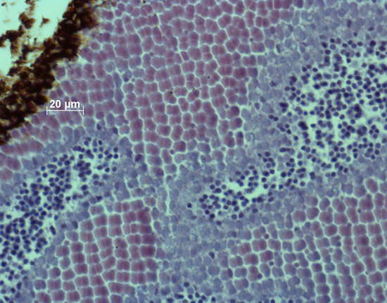 In 7 out of 13 specimens of the old population (54%) small single cones were sporadically observed in non-specific retinal regions. In the modern population, the inner segments or ellipsoids of single cones were never spotted. In 8 out of 16 specimens of the modern population (50%) relics of single cones, possibly the remains of their nuclei, were sporadically observed in non-specific regions.