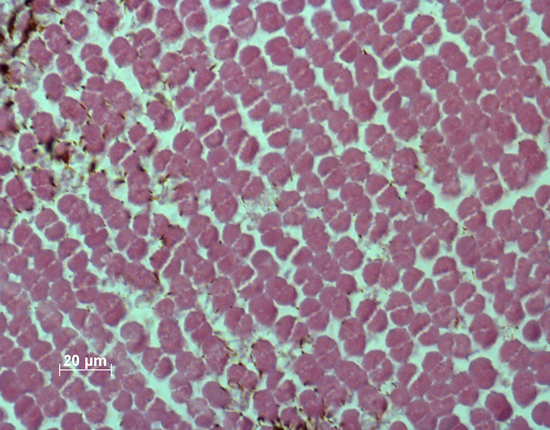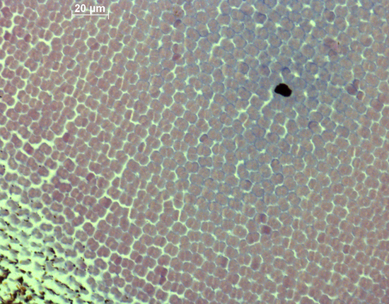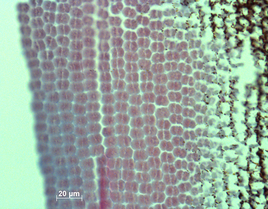 In the retinas of both the old and modern populations, the double cones were more or less irregularly set out in rows. In both populations, the highest densities of double cones were predominantly found in the caudal periphery, whereas the largest cones were mostly measured in the rostral part of the retina.