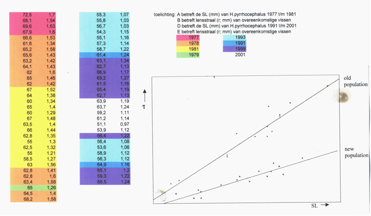 The mean SL of modern H. pyrrhocephalus was slightly, but significantly smaller (61.4 mm) than that of the old population (64.2 mm; ANOVA, P = 0.025). The lens-radius of the modern population (r = 1.21 mm) was also significantly smaller compared to that of the old population (r = 1.46 mm; P < 0.001). Due to a constant ratio between lens diameter and eye diameter (Matthiessen’s ratio; Otten, 1981) the lens radius would serve as a measure for eye size. The relation between lens-radius and standard length showed consistently smaller lenses in similar sized specimens of the modern population, indicating a significantly smaller eye-size compared to the old population.