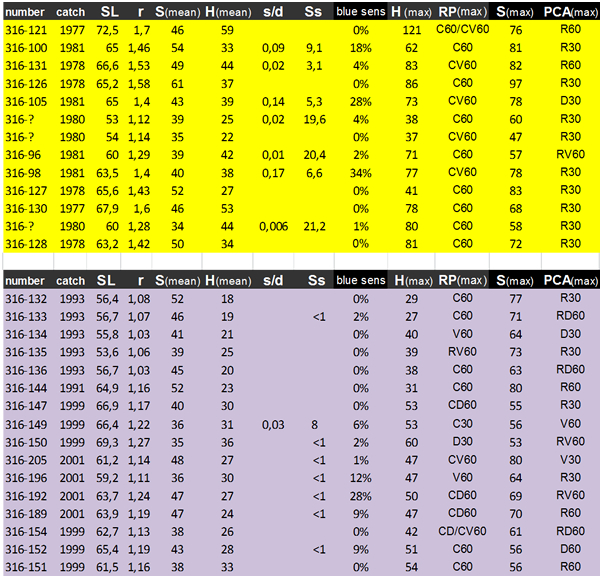 The morphological data of the double cones concerned size and angular density. Since the angular density is a function of the lens-radius, its correlation with r has no significance. The Hd and Hmax (the latter in the caudal periphery) have significantly decreased in the modern population (with 28% and 33% respectively, P<0.001). Both the Sd and Smax of modern specimens with a small standard length (SL < 60 mm) tend to be larger compared to those of the old population (15% and 17% respectively), while Sd and Smax of larger specimens (SL > 60 mm) have decreased in the modern population(with 13% and 19 % respectively) which altogether results in a significant interaction. Estimated marginal means (EMMs) of both factors differ only slightly. In relation to the lens-radius, Hd and Hmax did not show a significant time effect, while for both factors there was a significant effect of eye-size (r) itself. Both Sd and Smax showed a significant interaction with EMMs differing only slightly.