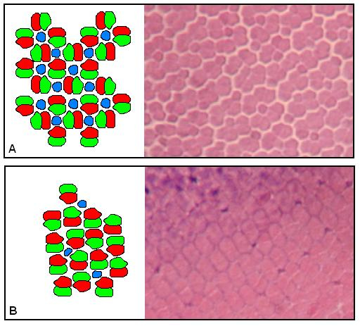 Young haplochromine cichlids develop retinas designed for trichromatic vision: a regular mosaic of blue sensitive single cones surrounded by four unidentical red/green sensitive double cones, also called a square pattern (Otten, 1981, van der Meer, 1992). New cones are formed by cell division along the periphery of the retina (Powers & Raymond, 1990). During the life-long growth of the eyes, the square pattern may remain unaltered (Fernald, 1985). However, in many of the haplochromines, the single cones diminish or disappear completely in some retinal areas whereas the double cones reorient and become enlarged, thus increasing their photon catching ability (van der Meer et al. 1995). Within some species the potency to adapt to an ambient red shift may be stronger than in others.