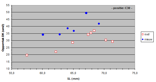 The Standard Lengths (SL) of the old population varied from 56,5 to 71,4 mm and SL of the new population varied from 59,5 to 69,2 mm. The measured lens radius (r) was plotted against SL in both populations.