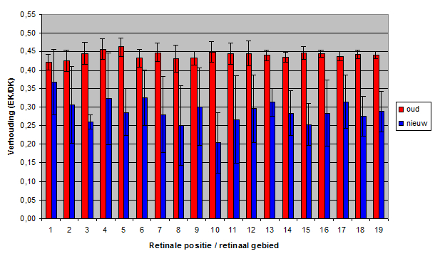 The size of the double cones (Sd) in the old population varied from 12,94 to 46,95 mm2 and Sd in the new population varied from 16,64 to 49,51mm2. In the rostral region of the retina no significant difference in the size of the double cones could be established. However, a significant enlargement of the double cones was found in other parts of the retina of the new population, especially in the caudal region. In general, one can say that the double cones have become larger in the new population.