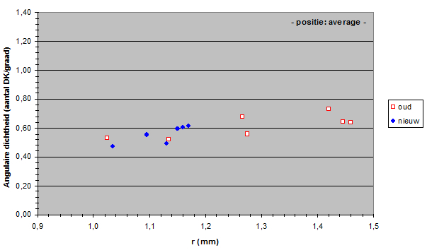 The angular density of the double cones varied from 32.3 to 136 in the old population and from 32.1 to 92.4 in the new population. Only in the medial dorso-caudal (D30, C30) region a significant drop of angular density was found.