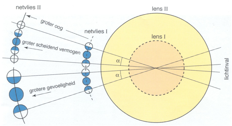 Where i is the image-distance (the distance between the centre of the eye-lens and the photoreceptor layer). The image-distance as a function of the lens-radius is often taken as the mean value of 2,5 . r (r = lens radius) conforming to Matthiesen’s ratio (Sivak, 1990).