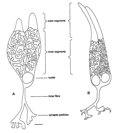 At higher light levels the rods are screened off from the incoming light and the photopic system becomes effective. The similarity in retinal architecture among the haplochromine cichlids suggests the same degree of cone convergence in the closely related species. In a comparative way the photon catching ability is of major importance. The photon catching ability of individual cones depends on their size and the properties of their visual pigments. With respect to the spectral sensitivity, one can distinguish between the short wave sensitive single cones and the medium/long wave sensitive double cones.
