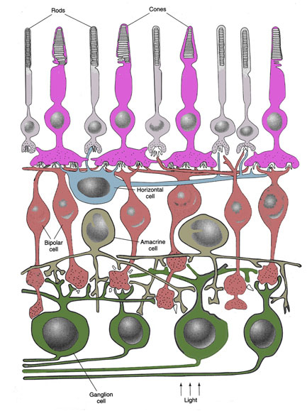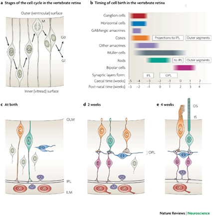 Early development of the retina starts from inside out with the ganglion cells to cones dominating rods and from centre to periphery where new neurons, except rods, are added from the retinal margin. The latter process continues throughout life in fish and some amphibians.