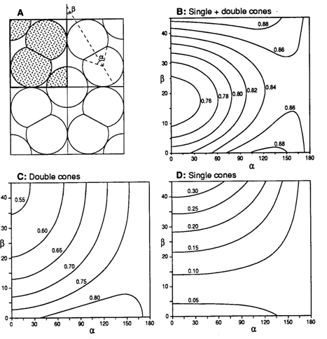 However, if the double cones are optically coupled, the opposite is the case as a double cone takes more room and the cone-density, as a consequence, decreases. For the same reason, movement detection as a function of resolution can neither be improved by mere double cones in spite of what some authors may have believed (Lyall, 1957; Wagner, 1978; Campenhausen & Kirschfeld, 1998; Schwab, 2002).