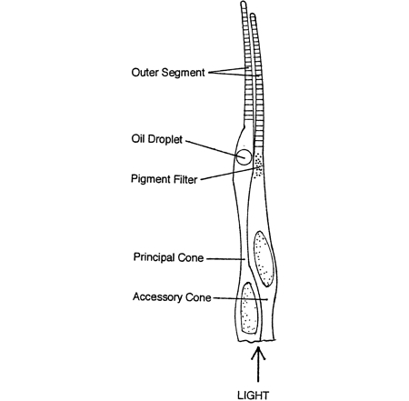 Thanks to the optical coupling, the guided light beam in a double cone can be partly absorbed by two sets of different photopigments. In view of the microspectrophotometric measurements of the two members of most double cones (Bowmaker, 1991), it seems obvious that a joint venture of the two members of a double cone results in a broader spectral absorbance of a guided light beam.
