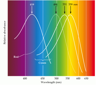 Double cones never contain short wave photopigments. Even in the absence of single cones their absorbance maxima are usually above 500 hm.. This does not mean, however, that double cones are necessary to carry middle- and longwave photopigments as these are carried by single cones as well, even in the presence of double cones with the same photopigments (Bowmaker, 1995).