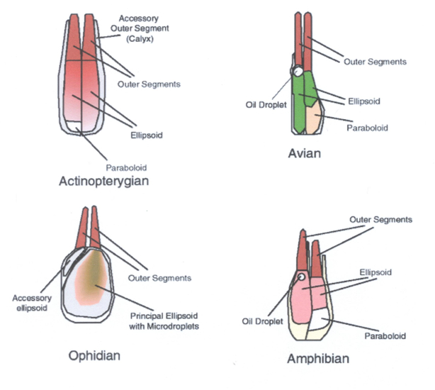 Paired or double cones can be either equal (percomorph fish, amphibians) or unequal (reptiles, birds, cyprinid fish) in shape, the latter consisting of a principle and an accessory member. Double cones can also be identical or unidentical with respect to their photopigments. Unequal double cones are generally unidentical. Identical equal double cones are also called twin cones (Wagner, 1990).